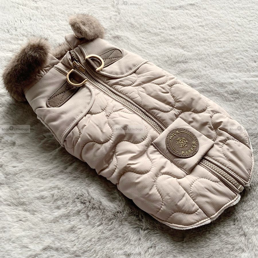 Gesteppte Daunen-Jacke mit Geschirr in hellem Taupe, hergestellt aus wasserabweisendem Stoff.