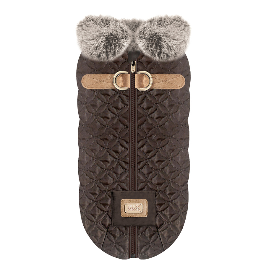Gesteppte Daunen-Jacke mit Geschirr, hergestellt aus wasserabweisendem Stoff in Dunkelbraun.