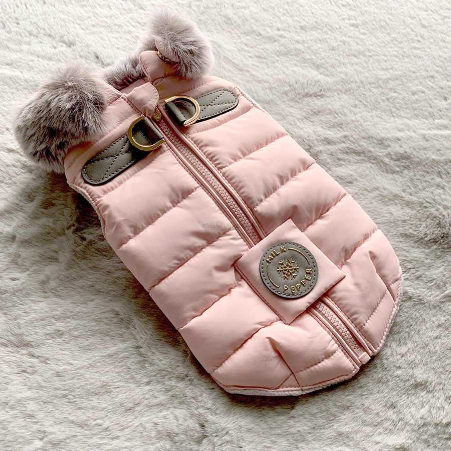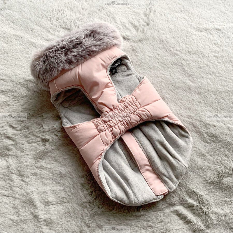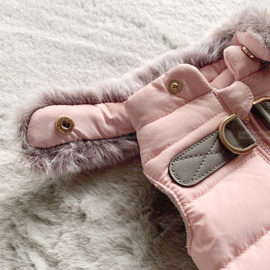 Rosafarbene, gesteppte Daunen-Jacke mit Geschirr, hergestellt aus wasserabweisendem Stoff.