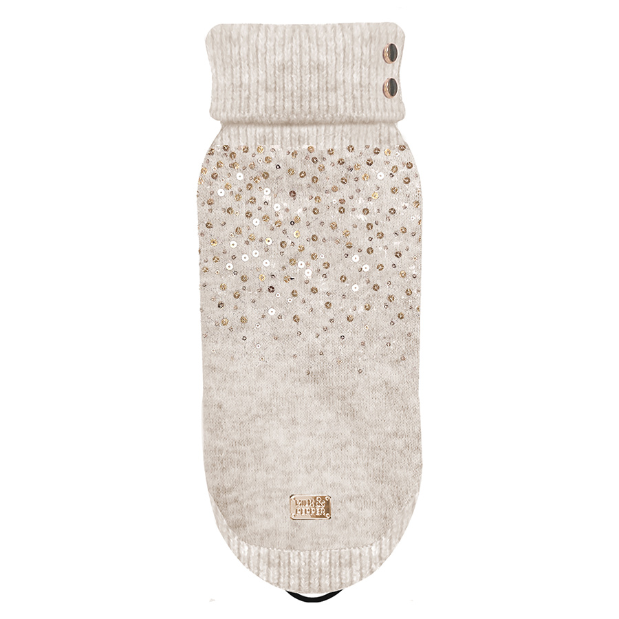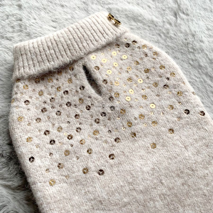 Warmer Strick-Pullover in Beige mit goldfarbenen Pailletten - für kleine Hunde, hergestellt aus 53% Polyester, 39% Acryl, 5% Wolle.