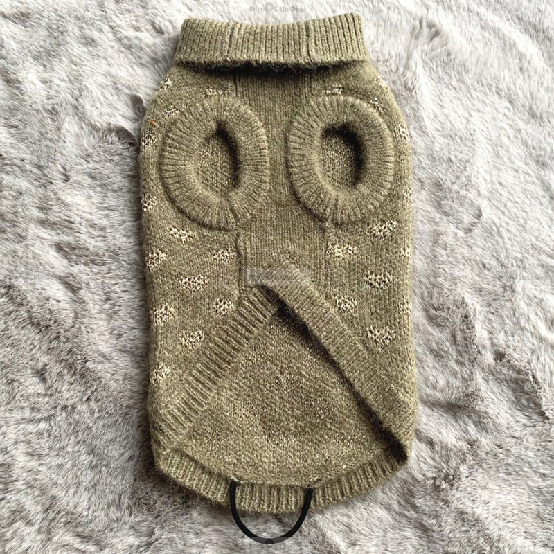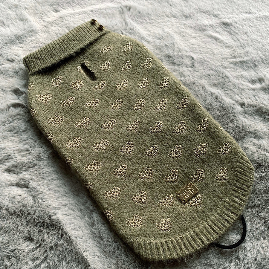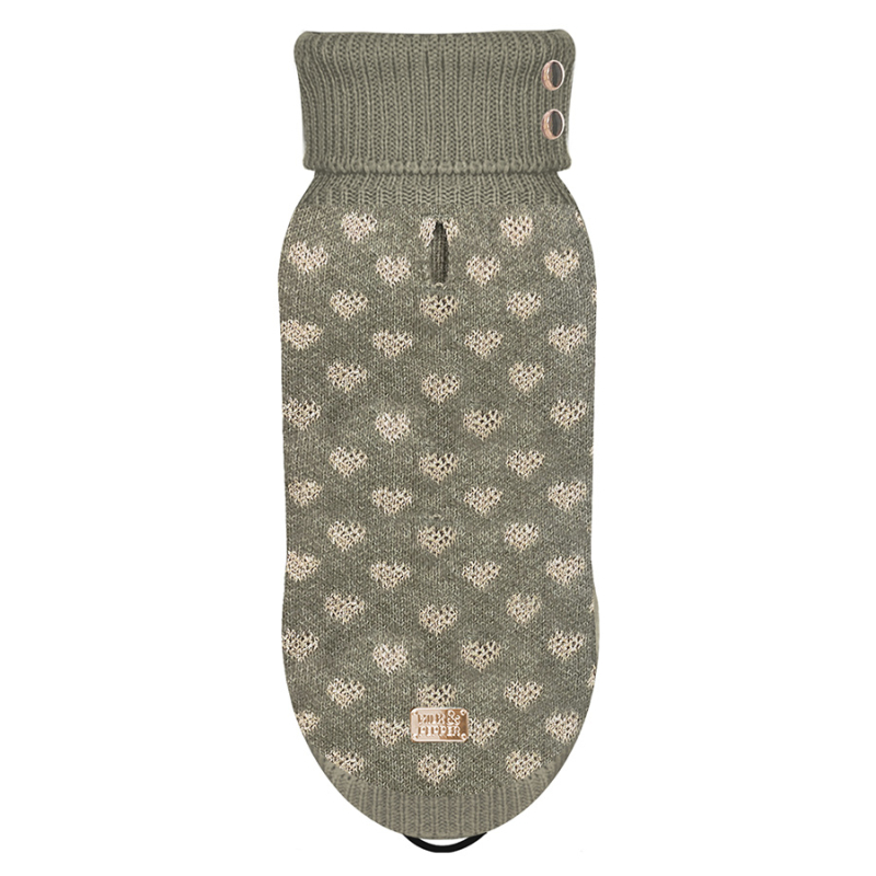 Warmer Strick-Pullover in Olivgrün, mit Herz-Muster aus goldfarbenem Lurexgarn - für kleine Hunde, hergestellt aus 53% Polyester, 39% Acryl, 5% Wolle.